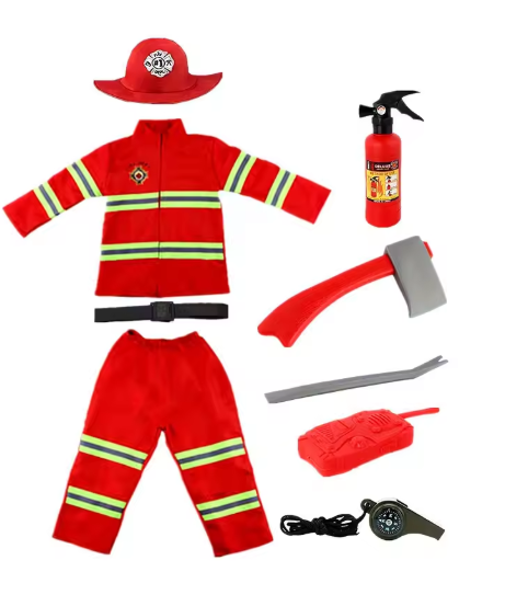 مع لعبة مكافحة الحرائق الواقعية، زي رجل الإطفاء الأحمر للأطفال بسحاب، زي لعب للأطفال في المنزل الممتع للحفلات